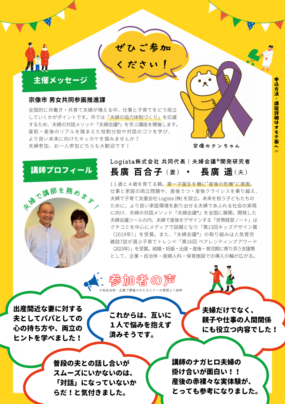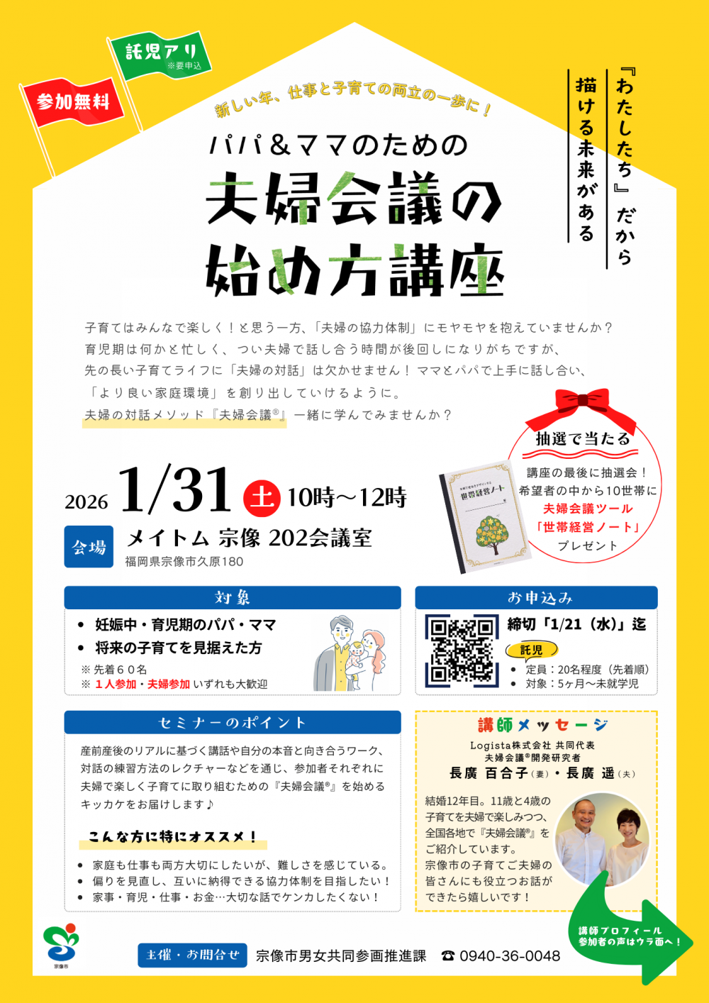 今回の、パパ&ママのための「夫婦会議の始め方講座」は、福岡県 宗像市(男女共同参画推進課)主催で開催されます。