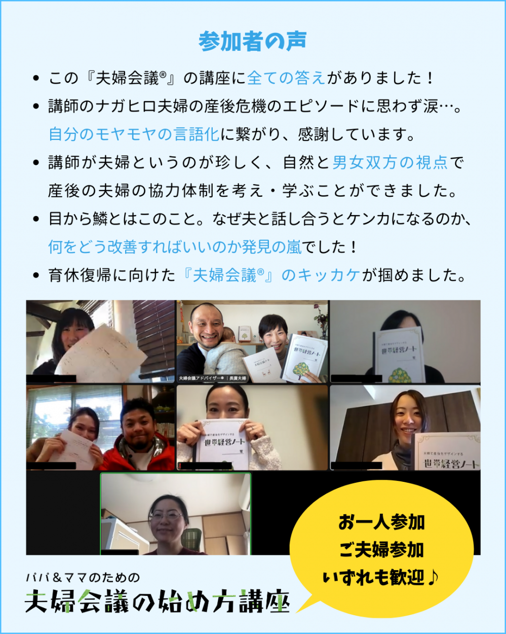 | 講座名 | パパ&ママのための「夫婦会議の始め方講座」 |