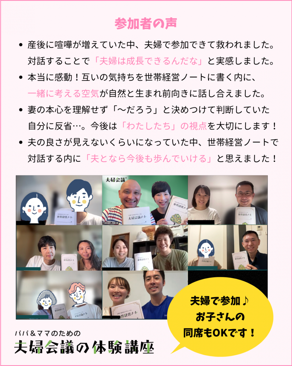 ・ふたりだけで話し合っても行き詰まる中、皆さんと一緒に『夫婦会議』に取り組んで気持ちが軽やかになりました(30代・妻)