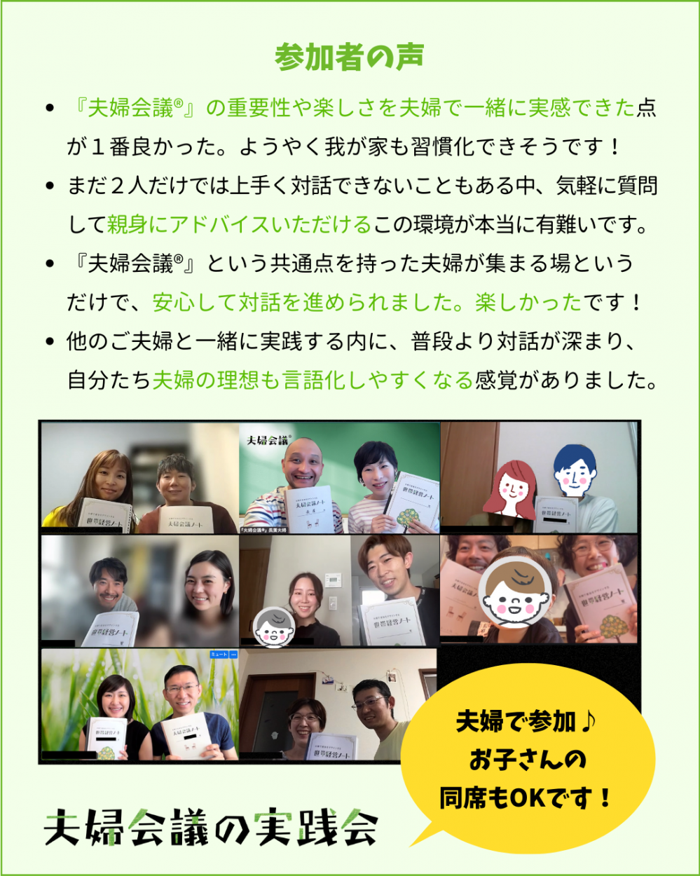 ※「夫婦会議の実践会」は文字通り「実践すること」に重点を置いています。実践を通して学べることもたくさんありますが、まずはお一人で『夫婦会議®︎』の始め方を学びたい方、夫婦でプチ体験してみたい方は「夫婦会議の始め方講座」や「夫婦会議の体験講座」への参加もご検討ください。