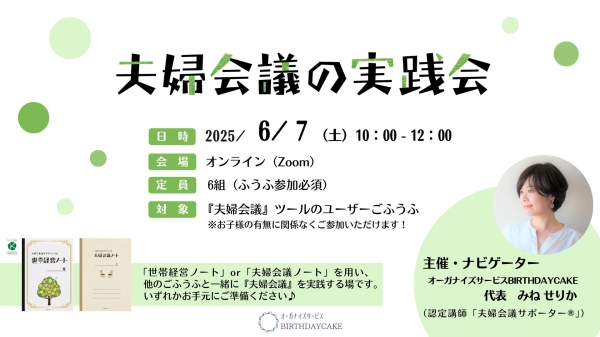 お一人でも参加可能な「夫婦会議の始め方講座」、夫婦参加型の「夫婦会議の体験講座」「夫婦会議の実践会」など、さまざまな場をご用意しています。オンラインで気軽に参加いただける講演イベントや「参加無料」「プレゼント付き」などのイベントも開催中。ぜひ定期的にチェックしてみてくださいね!