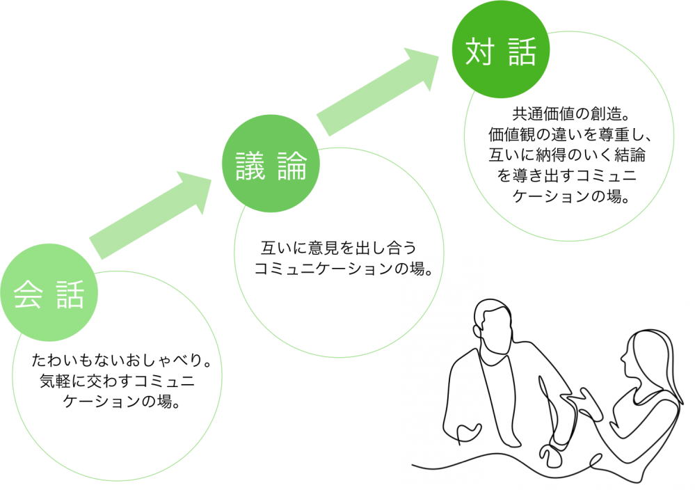 「対話」とは、価値観の違いを尊重し、互いに納得のいく結論を導き出していくコミュニケーションのことです。